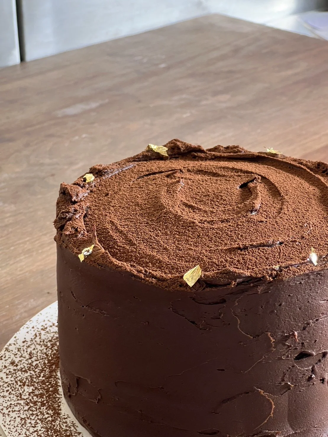ลาสสอนเค้กช็อคโกแลต เนื้อเค้กช็อกโกสุดเข้มข้น และเลเยอร์ชั้นด้วยครีมช็อกโกแลตกานาจ โรยด้วยผงโกโก้ตกแต่งแผ่นทองคำเปลวบริสุทธิ์