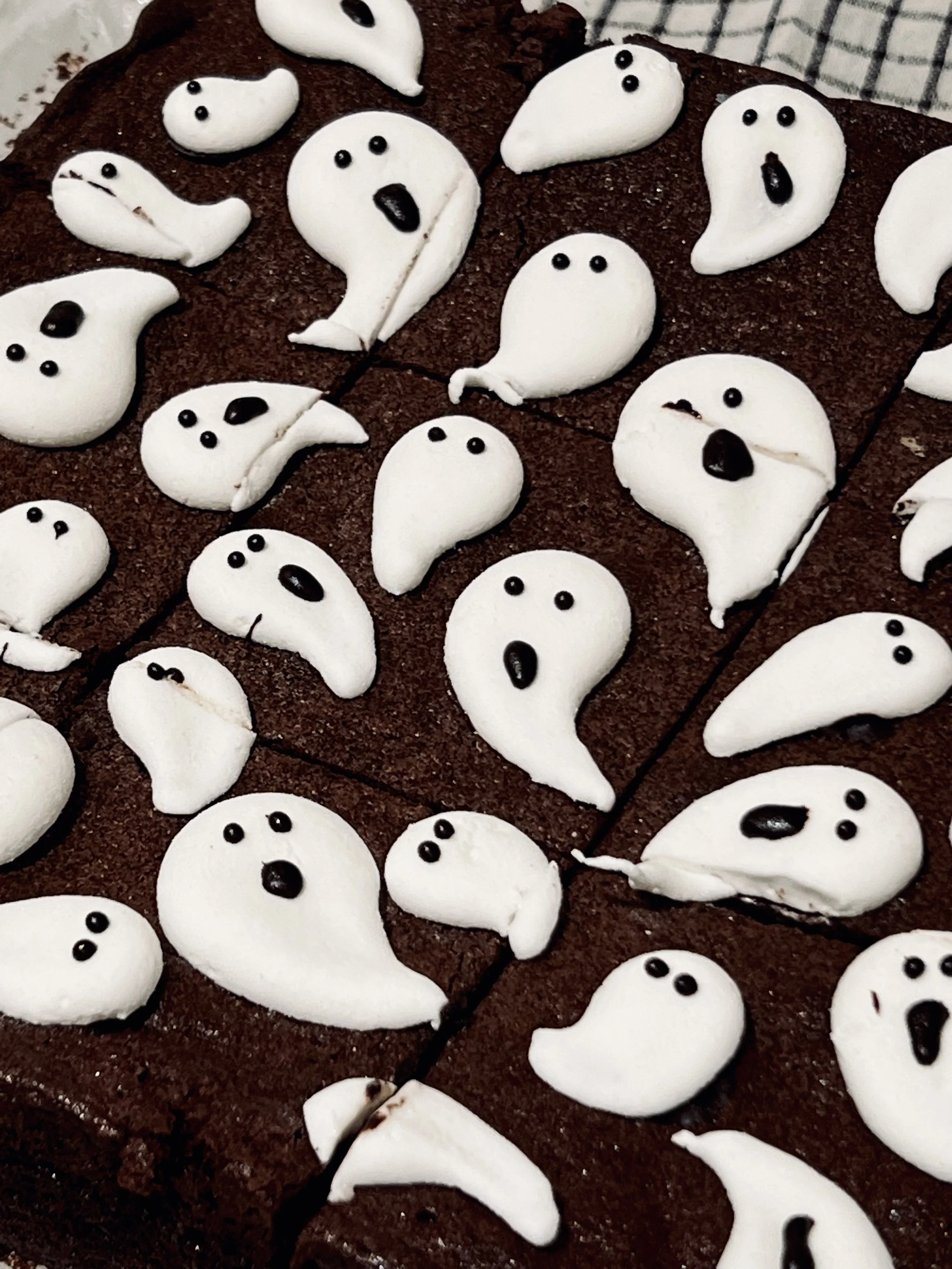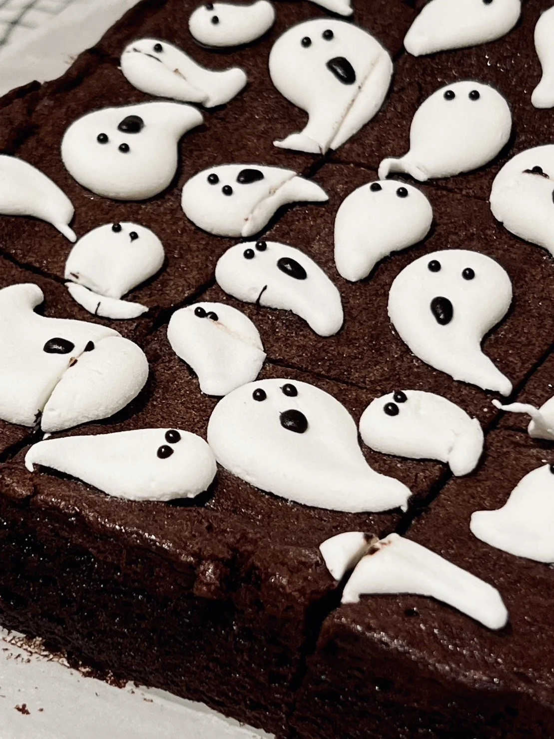 Ghost brownie : บราวนี่เนื้อหนึบอัดแน่นด้วยช็อคโกแลตอย่างดี ตกแต่งด้วยน้องผีมาชเมลโล่วตัวจิ๋ว