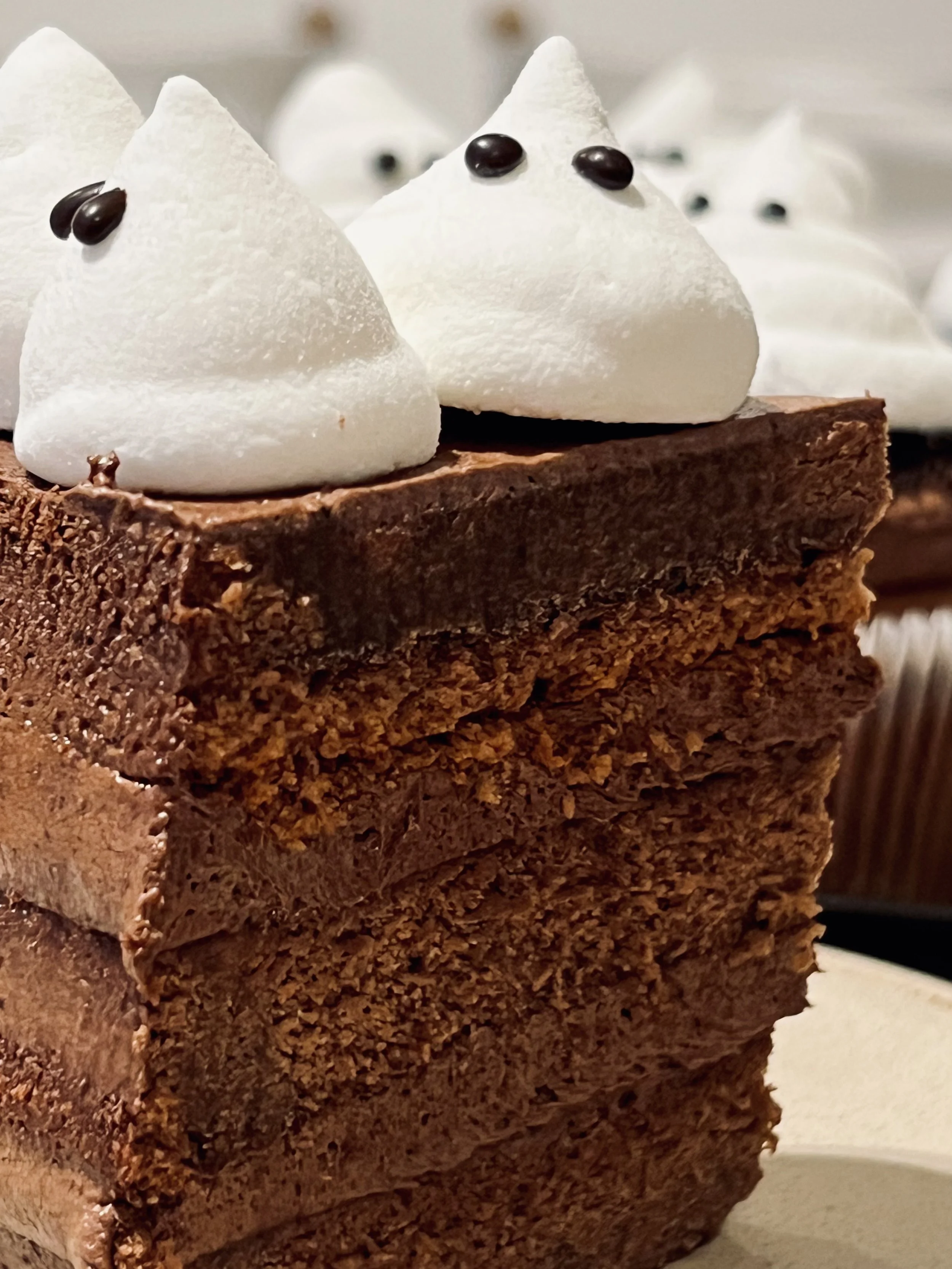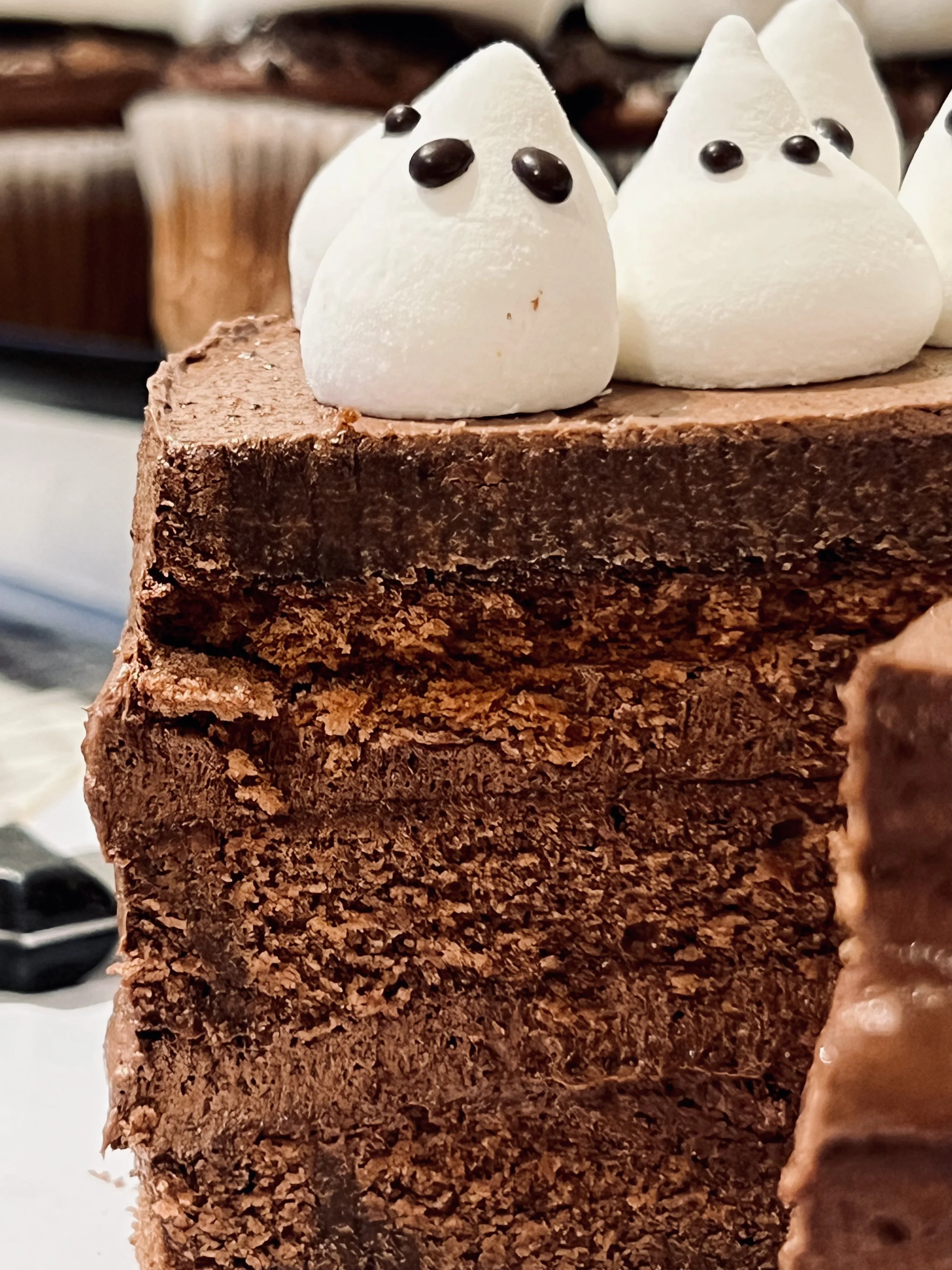 Ghost cake : เค้กช้อคโกแลตพร้อม ช็อคโกแลตบัตเตอร์ครีม ขนาด 3 ปอนด์ ตกแต่งด้วยน้องมาชเมลโล่วผี