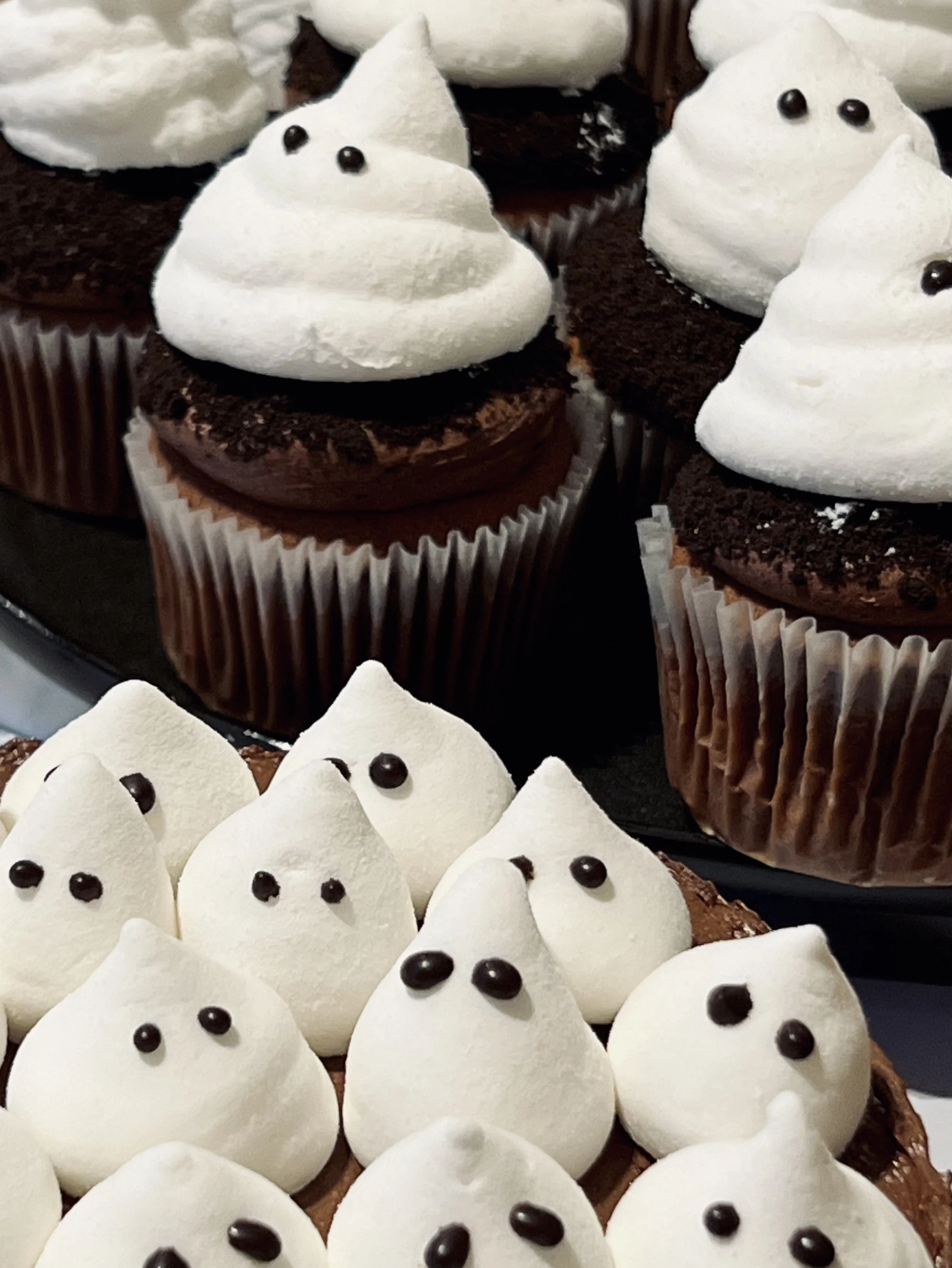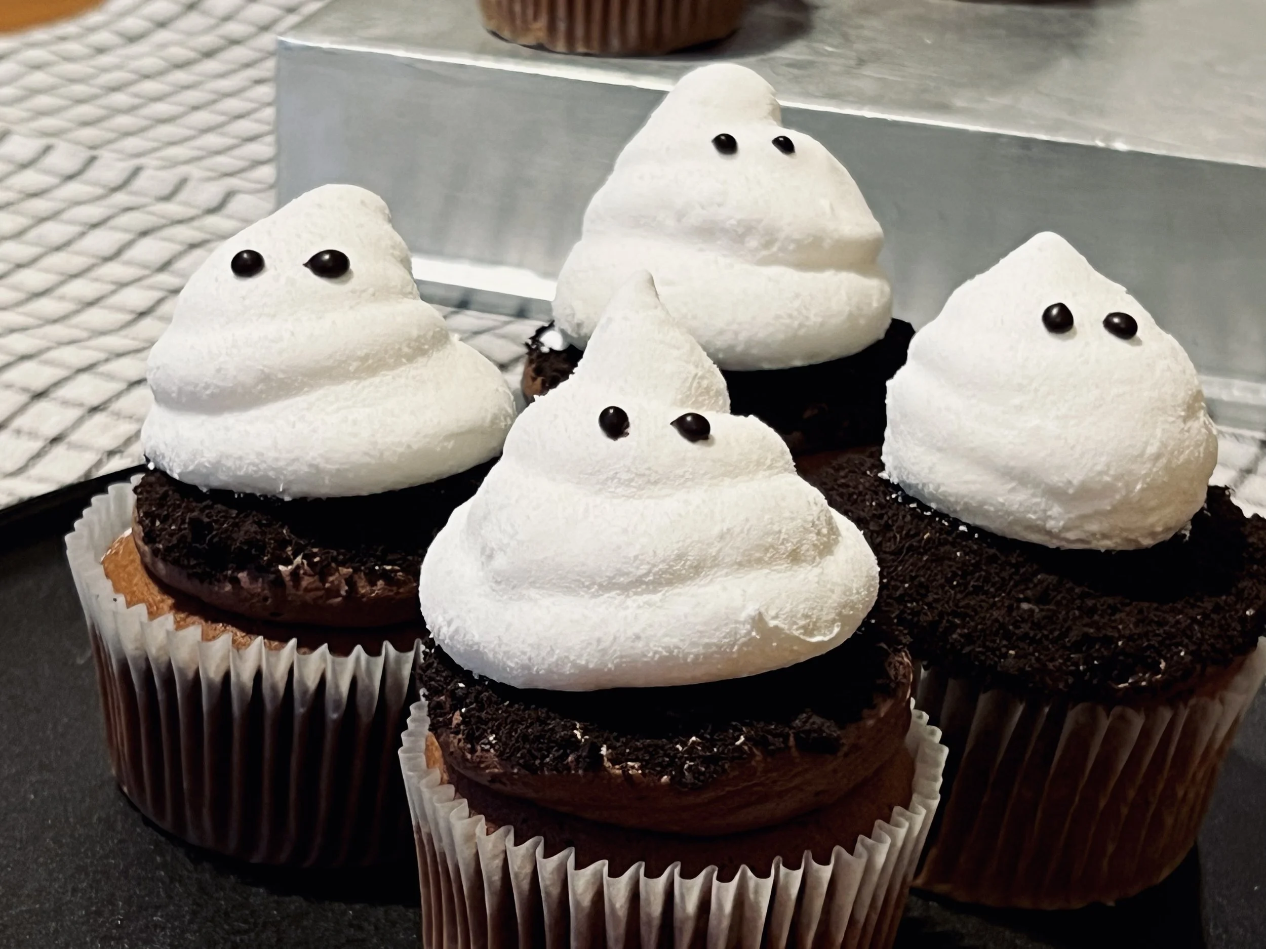 Ghost cupcake : คัพเค้กช็อคโกแลต ครีมช็อคโกแลต แต่งหน้าด้วย มาชเมลโล่ว น้องผี